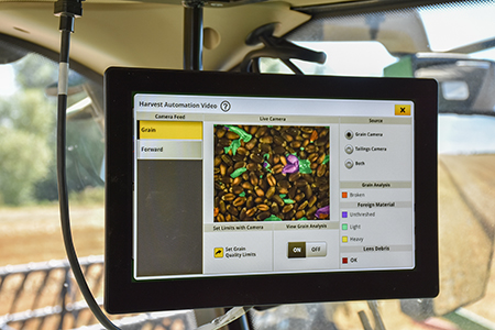 There are cameras on the clean grain elevator and the return elevator to monitor the cleanliness of the grain and what type of material is going through the return, and also to monitor the losses from the back of the combine. This information is fed back to the machine, which will make automatic adjustments to ensure the pre-programmed parameters are being met at all times.