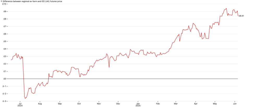 However, cash prices have generally held up better than futures. In the Midlands, the ex-farm basis (the difference between the regional ex-farm price and the futures price) has swung markedly over the past year, from -£3 on 9th July 2024 to +£9 on 9th June 2025.