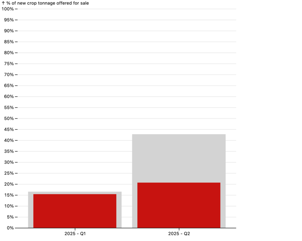 While the proportion of new crop sales in the first quarter of this year was at a similar level to 2024, the second quarter has seen a marked decline in pre-harvest trading, falling from 42% of tonnes offered by farmers last year to just 20% this year.
