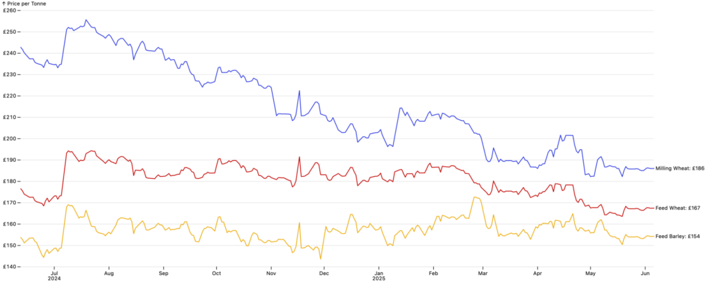 Futures prices have drifted downwards over the quarter, with the UK (ICE) Feed Wheat July 25 contract falling to £159.05/t on 9th June 2025.