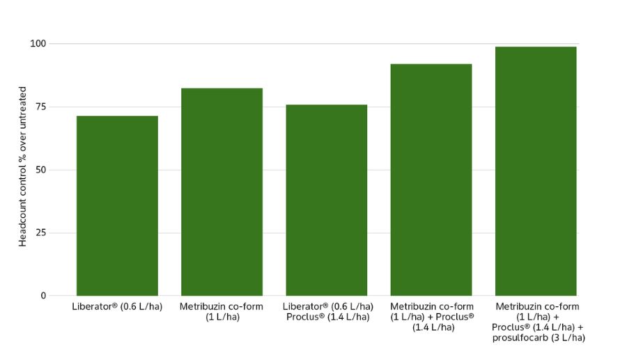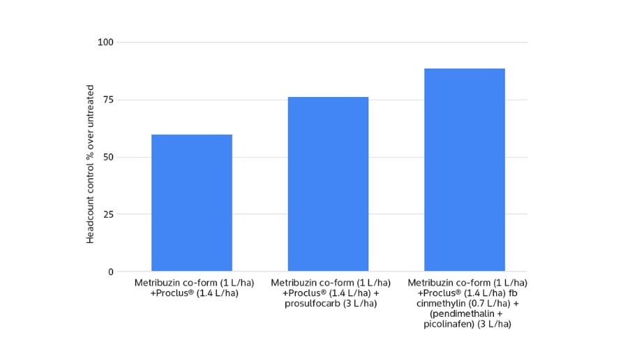 Metribuzin co-forms like Alternator® Met, Octavian® Met and Cadou® Met contain three different MoAs with root and shoot activity. Including Proclus® adds a fourth MoA to improve control and increase longevity in the programme.