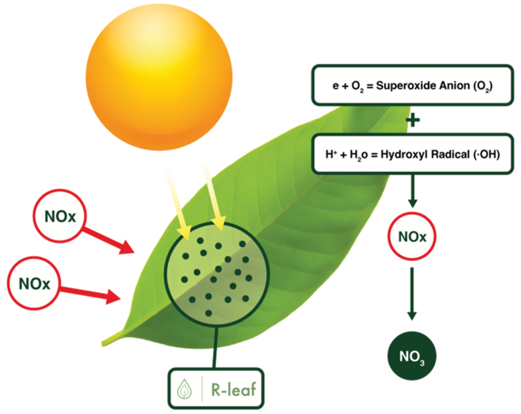 “In addition to converting pollutants (NOx) into nitrates, R-Leaf also breaks down nitrous oxide (N₂O), a damaging greenhouse gas (GHG) known to be 265 times more potent than CO₂, into benign nitrogen and oxygen.”
