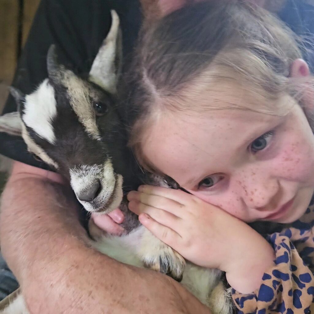 Six-year-old Rae is happy that the goats were found safe, photo by Honeycomb Farm.