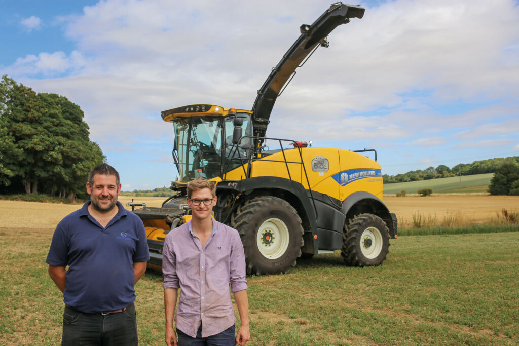With the New Holland forage harvester are Ernest Doe Braintree depot area sales manager Mark Jolley (left) with Fox Feeds operations manager Freddie Barclay.