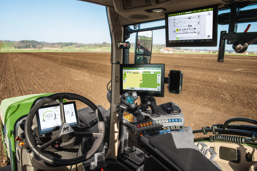 The Fendt 300 Vario Profi model has an optional 12in terminal on the armrest as well as the 10in digital dashboard, allowing you to show Isobus applications and tractor functions at the same time.